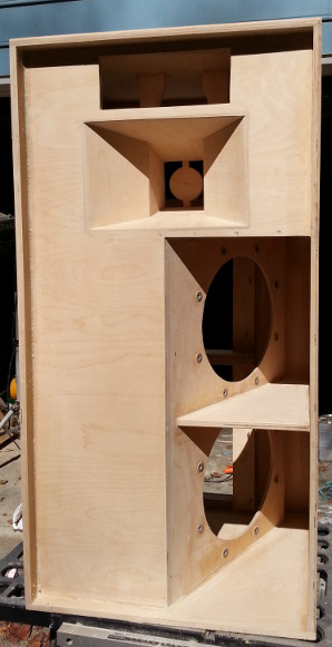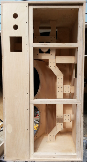 The thing that decides the question is, those 3012LF woofers actually DO NOT fit, now that the back flanges are in the one cabinet I've got drivers for :oops: . They can't make the turn to go up against the baffle. Bum city, but it is entirely my own doing: ignoring both plan and model, I aligned the vertical internal brace with the edge of the midrange horn baffle, as some of the earlier photographs in this thread clearly show.