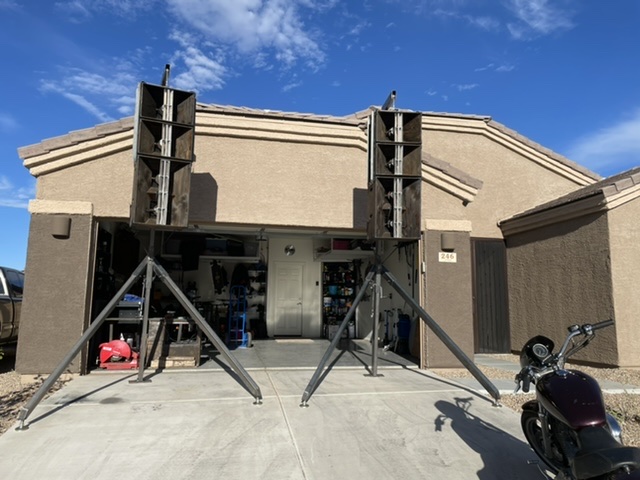 It has been a while since I have posted up anything. At the first of the year I fabricated some stands to fly my rig 12’ in the air. It’s awesome but adds 2 hours to my setup and tear down. I charge more if my client wants that caliber of rig setup. I finally optioned to paint or duratex my rig. It took me 2.5 gallons with two coats rollered on. I did my six otop12s and my 5 tuba45s as well as my amp rack. The stuff is not indestructible but it sure looks nice. Easy enough to touch up too.