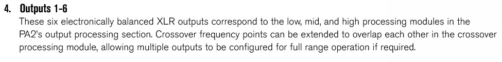 That part I was not aware of. Sounds to me, like either of the outputs can be set to anything from full-range to any frequency range than one desires. The lable at the back "Low" "Mid" or "High" are just suggestions when it comes to how to use those outputs. The advantage of digital cross-over compared to having actual coils doing the job. Nice flexiblity.