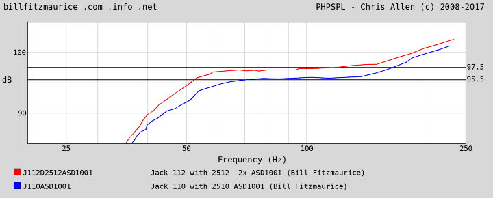 This chart represents the O12 with a Delta12LF. If I'm not mistaken, with the 3012LF or dual BP102s, the O12 is about 6dbs hotter in the low end. If so, that would put it about neck and neck with the Jack 2x10 from 70-100hz, but the O12 would kick Jack's ass from 40-70hz. In either configuration, the driver(s) would have greater Vd than the Jack's drivers, so max possible output wins, too.