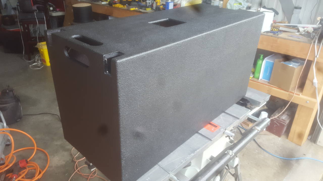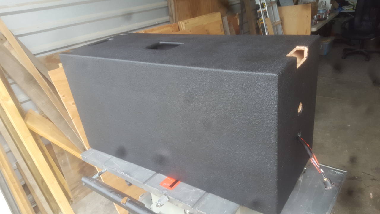 DuraTex'd 5 sides. Looks pretty good. A couple spots I missed filling show through, although I'm not sure the average person would notice or not. I'll work on getting the access panel and mouth area finished up tomorrow. Then, I guess it's just down to putting all the hardware in and deciding which driver to put in it for Dad duty. I wanna hear the S2012. It's such an interesting driver to me. I'll let you guys know what I think.