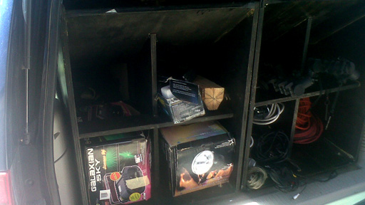 Enclosed are pics of the adventure complete with a dead battery, two hours late and the other sound guy that was doing a electro dance with us pulled out because of Sub-woofer size associated penis envy. Plus we found that the Tri-pod Cradle can be broken down to become a support sled for rooftop transport.