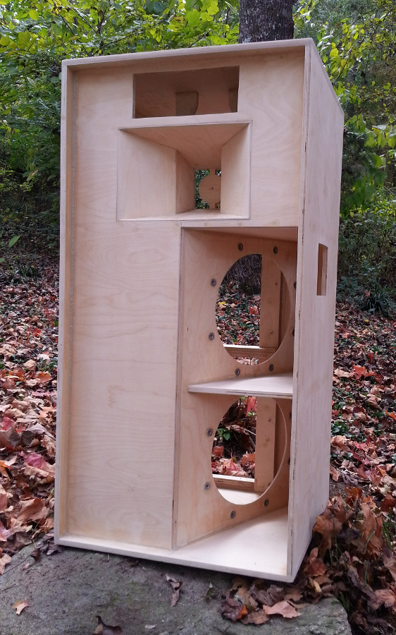 Milestone: the first cabinet is major-woodwork-complete :hyper: ! Vertical brace fix glued&screwed, all holes filled (and I really like auto-body filler for that job, it sets fast and hard, thanks Bill), external sanding through 220 grit complete. Have cut the baffle restrictor plate but not yet installed it, need to put in the T-nuts for that and for the 12" steel grilles for the woofers, and run one more PL fillet along one seam between the lower woofer horn brace and the side of the cab, and it will be ready for finishing/cladding.