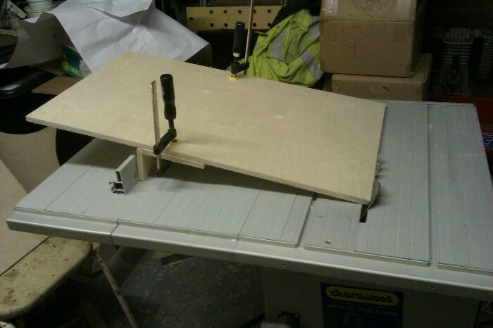 Largest panel mitre cut - wouldn't fit on table saw, so angled it up over the fence on one of my right-angled jigs, used a bit of trig to modify blade angle settings and got a good result, as below.