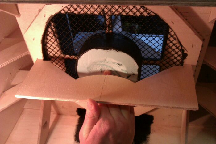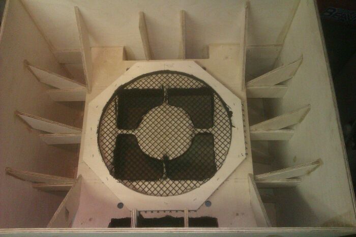 Mesh (hardware cloth) going in now. I snipped out a small area where the speaker fasteners will go through, as a precaution, to aid fasteners going in cleanly. Contrary to plans i have stapled these plywood spacers in. Middle 5" dia disc not in yet. Am going to put 1x6mm thick disc in and then cut foam phase plug to remaining required thickness.