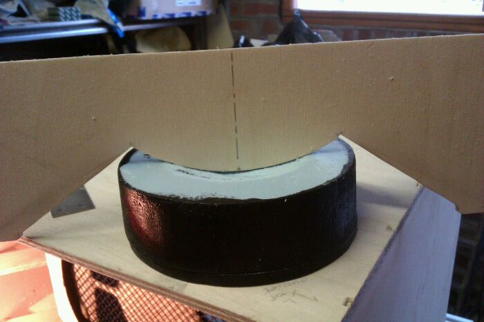 I decided some time ago that I'd make a cross-section cut-out of the speaker I am using, to hold against the phase plug in situ, so I can have a good look at it and satisfy my curiosity about off-sets, gaps or what have you. The picture shows me pressing the phase plug and a 6mm thick ply disc up against the back of the wire cloth. There is about a 15mm gap where the tip of my finger is. I dressed out the radius of the speaker centre dome in the phase plug, using an angle grinder, and neatened it with sand paper. The speaker cross-section profile geometry was made as with 'mounting gasket uncompressed', so if there's say 3mm gasket compression, there'll be half an inch clearance from the speaker to phase plug when the speaker is stationary. Seems sufficient to me. Any thoughts, anyone...?