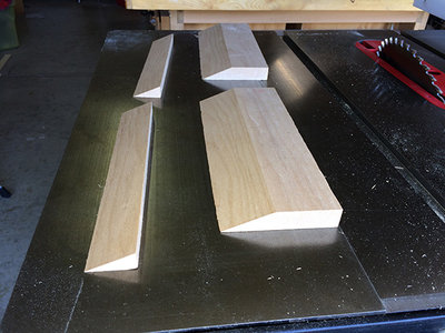 Both blanks cut. The smaller cut-off is actually the closest to the size in the plans. But I wanted a little more meat to the nacelles, so I used the bigger ones. Trimming them to the final size. Final size. All 16 of them cut. They are 3/4" wide.