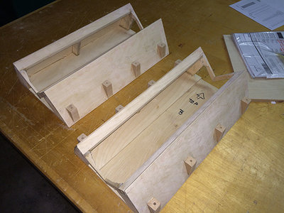 I drew the bottom reference line, then the spacing lines. Add some PL and hot glue to tack it place and we're good to go. It was pretty easy and straight forward and went quickly. All nacelles tacked in and set aside for the PL to cure. This is where the frustrating part of the day came in. It was time to work on the curved backs. First I tried to do it straight off without precurving the 1/8" BB. Big mistake! After the first one exploded on me. I decide to precurve the rest, like I should have done in the first place. But during the process, EVERY single one just snapped when trying to bend them. And of course, I cut some more from the rest of what I had, and they ALL broke. I figured out the they were too dry. We've had low humidity for the last week or so. Even with one day of rain, the BB was brittle dry. So I went back to the lumber yard and got another sheet. This time before trying to precurve them, I wet them down. Not a soak, but a pretty good wetting. Here in the pic, I've finally got them bent pretty well and they are going to dry for at least 24 hours, before I attempt continuing with the build. And just in case, I'm bending a couple more as back up. I used pipe and web clamps. The good thing that resulted from this frustration was I picked up more BB for my two Tuba 45 builds coming next. 7 sheets of 1/2" in total. I also got a discount for more that 5 sheets... ended up costing $22.50 a sheet. Not bad.