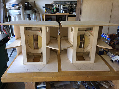 While the curved backs were being precurved, I worked on the HF module a little bit. Putty filled all the holes. All the filler sanded smooth. I had the curved back panels pre-curving for about 3 days. This is after releasing them. Stubborn things. Really resistant to change. But they were good enough to work with. All the panels glued in with straps and clamps. A good tip: have a trusty helper to work with you. Helps with the (in)sanity. I also drilled the access hole for the speaker wire. I did not seal off the wire and hole until the panels have set. I also filled the back seam between the panels with PL to make sure of an air tight seal.