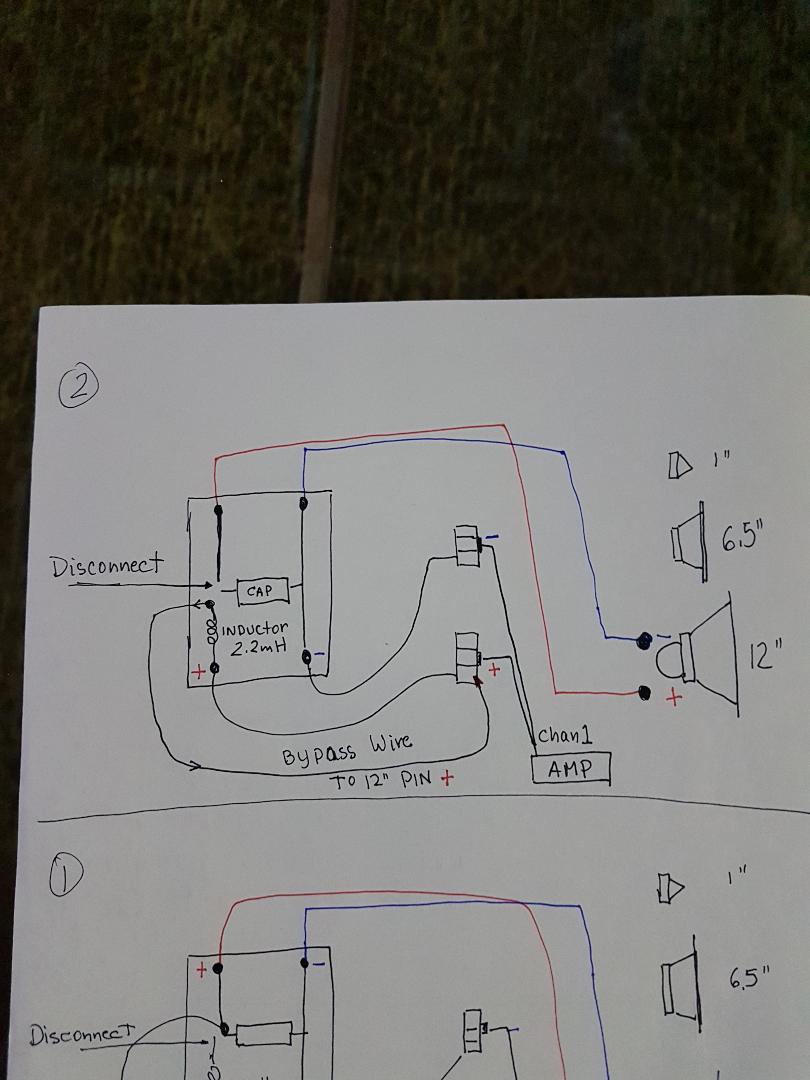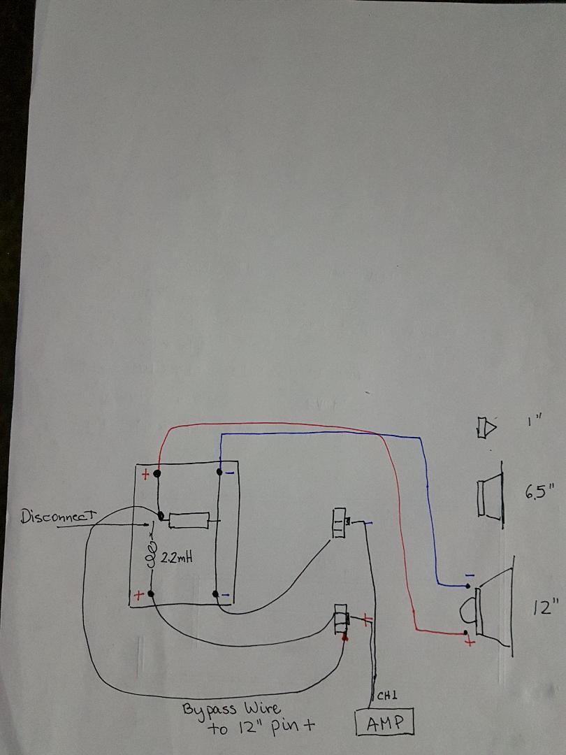 So you want me to leave the Neg input > Cap Side > Neg Out (Top) > woofer Neg as shown on the drawing above? Then with the spare 20" wire Pos tap out back to the 3 way 12" in pin Bass then power up the system and see if I get music out of the 12"? Wouldn't that short out the amp?