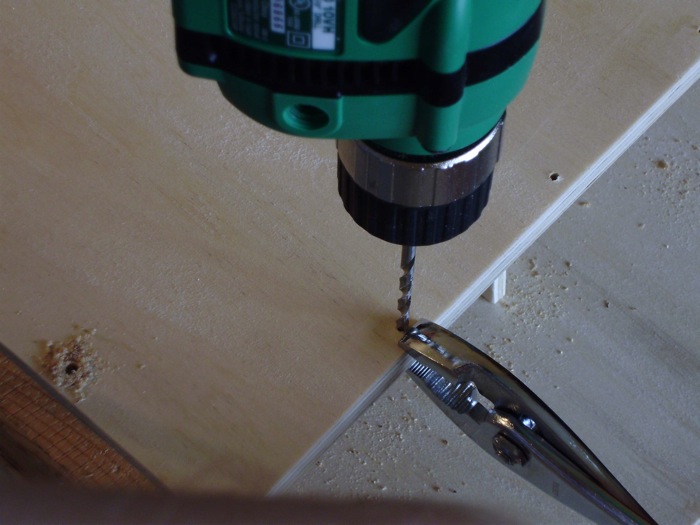Here's a quick and dirty way to prevent plywood from chipping when drilling holes close the end grain (Shown in the bottom picture