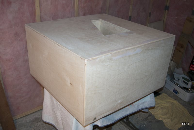 Here are some pictures from my recent 16" Table Tuba Build. Pretty much followed Bill's instructions. Cut most panels using a panel jig on my table saw as per Bill's design. The panels turned out pretty accurate and after the first few panels I started contructing without screws. I simply glued and clamped.. including the final side. Installed the 8" Dayton recommended driver. Powerred the unit with a vintage Audio Design PA100 MOSFET 100 watt per channel mono bridged power amp. Sounds great!