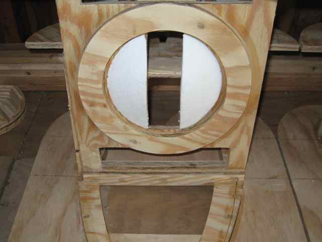 The dirty picture, no matter how many projects I've done, I (like everyone else) get better with practice and I have ended up with one speaker cabinet that just gives me fits. It's that one that didn't quite get the alignment patience it deserved or it was getting dark out and the mosquitoes were getting me. But here in the picture you can see how when I put the throat horn sandwich in between the top and bottom for attachment the only way that I could get it all squared in the cabinet squaring device I concocted was to slide that damn thing near to center as I could, and just deal with the special cuts that one cabinet would require.