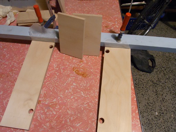 Here's all the mouth/baffle panels cut out and ready to go. The guide boards above I've protected with some wax paper so they don't glue to the job. I'm using a brad nail gun rather than screws.