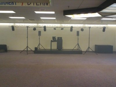 this weekend I did a gig at a small new hall, I'd say about 40 feet by 90 feet in size. I had a ton of time to set up, bc I got there the day before because I got 30 more feet of truss to test. so I went and eqed the setup to the room. I tried a bunch of configurations with the t60s to see which I liked best, and it seemed that side by side facing the office wall sounded best. that wall isn't a true wall, it doesn't go through the drop ceiling. it is basically an 8 foot drywall cubicle. it was about 9 feet or less to the actual building wall, so I can see where I didn't get much output below 30hz with my test tones. next time I will try a different position. (the pictures are a bit hazy, well.. because of the haze!!)