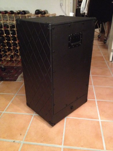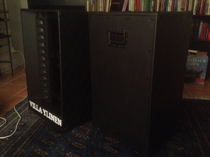 The name of his house had to be on the speakers and he wanted some chanel pattern on them aswell. I assembled the amp myself with a SMPS300r powersupply, a T3s amp and a MiniDSP to do some signal processing - highpass and EQ primarily.