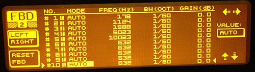 The next pic is page three of the FBD prior to pushing any feedback. Again, it looks to me that all 10 slots are set to Auto and ready to go. I set the SENS and THRESHOLD in about the middle of the scale. I tweaked these settings in both directions and it didn't change the outcome.