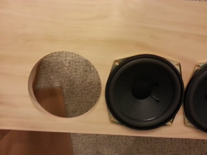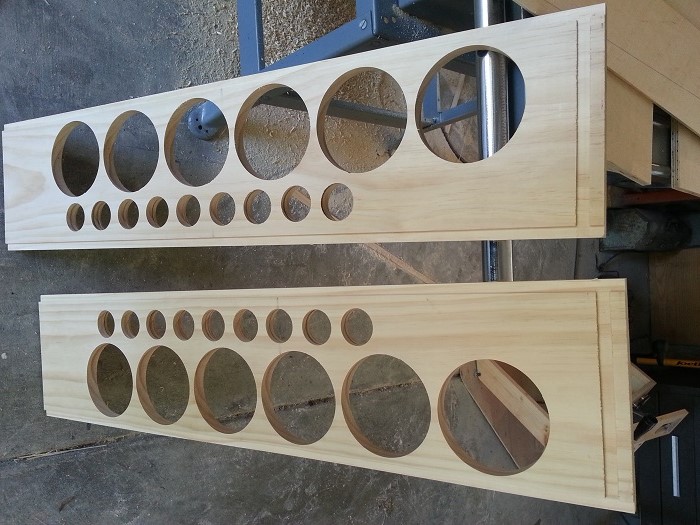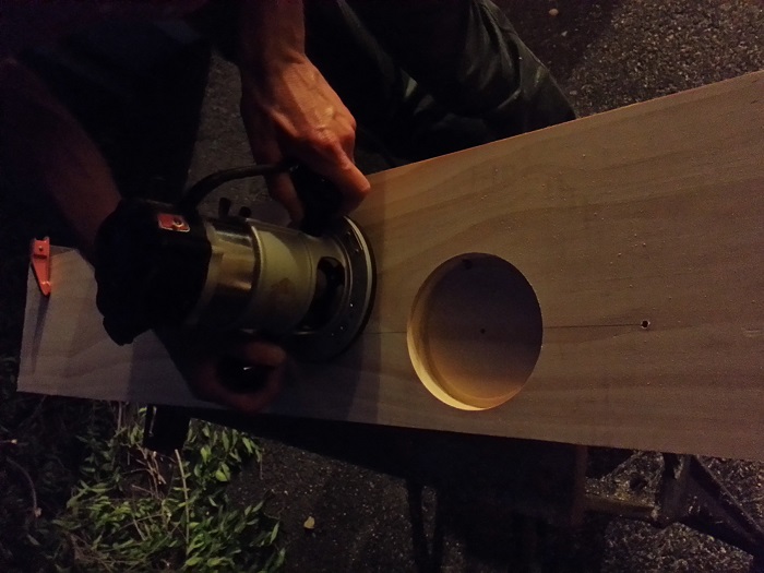 I will be rear mounting the woofers and front mounting the (recommended) tweeters. My dad and I spent some time drilling a hole in the router that will essentially be a template for the woofer holes (tested a cutout and it is perfectly snug) and got it right on the third try. I also bought a holesaw that with a little sanding works great for the tweeter.