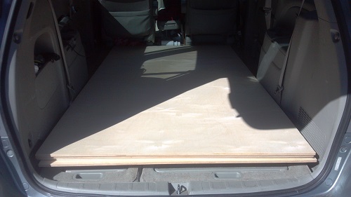 I started on my next journey today by purchasing 4 sheets of appropriate plywood. Here it is loaded in the car.