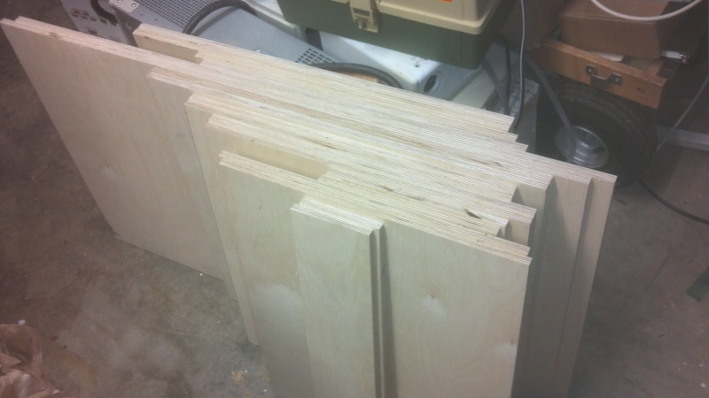 It was finally time to get some cutting done this weekend. My son helped me move the big sheets onto the saw, and I reduced 3 - 4x8 sheets of BB to panels. Then I drew out the guidelines on the first side of the first cabinet. That went pretty smoothly. With a few calculations I figured out how to get the two back braces (which necessarily have the same angle) to get cut at the same time. I've got just a few more panels to cut from the 4th sheet of plywood (another access cover, driver anchor, and the throat braces come to mind). As I was cutting braces I saw a couple things that would work better than the way I laid out my cutlist.
