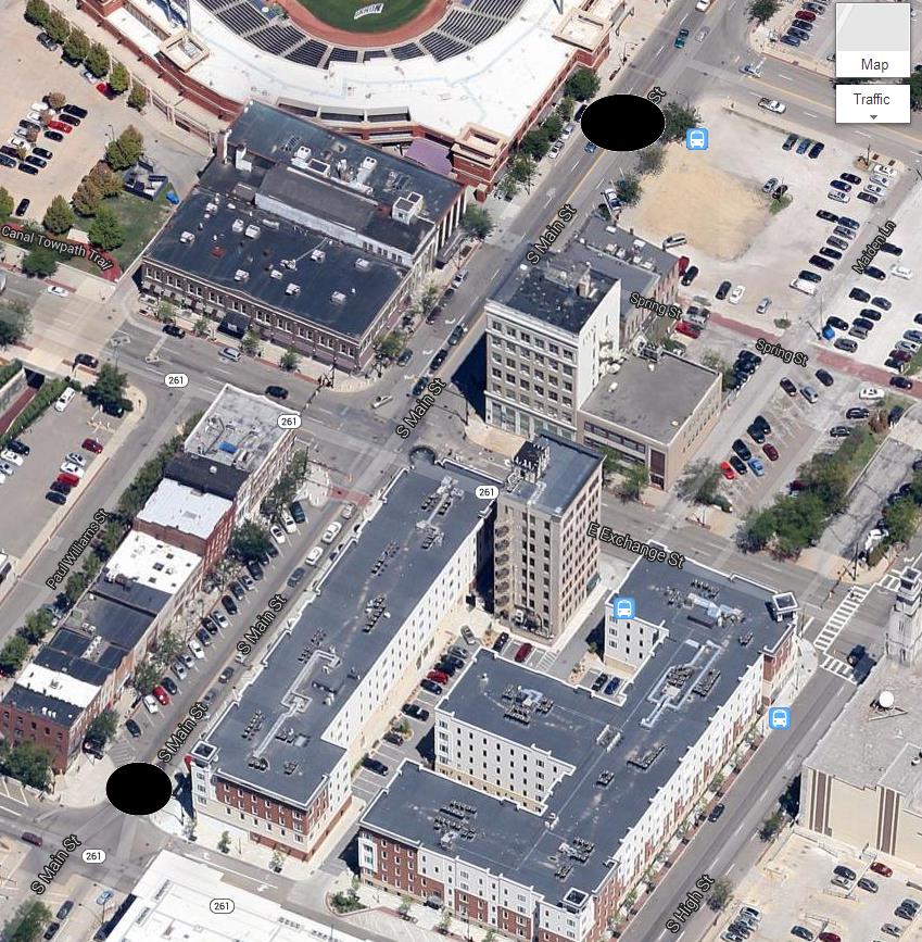 In the picture below, the block oval on the lower left was where the stage was -- the one on the upper right was about as far away as I walked to listen. I'm guessing this is between 200-300 yards.