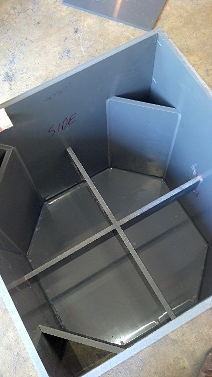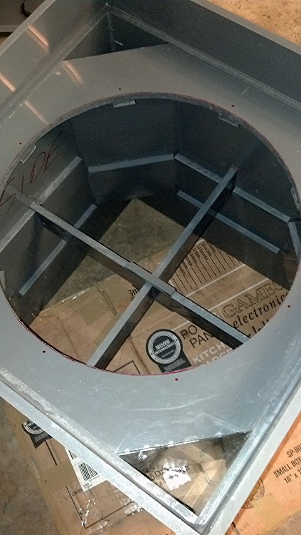 Once again, I’ve pressed ahead into uncharted waters to construct BFM cabinets that will live their entire existence outdoors, constantly exposed to the elements. The material of choice is ½” sheet PVC. . the gray stuff, just like electrical conduit you see in Home Depot and Lowes. The idea is to build a total of eight of these bad boys, and cluster them on top of the press box at the high school football stadium. Although I would love to say I followed the plans to the letter, the truth and reality is that I have made some cosmetic and minor structural changes from what the plans depict. First, the decision was made to mount these on their sides instead of in a down firing config as shown in the plans. After weighing the roof installation options, the Speakon location options and serviceability options in the future, side mounting seemed the correct route. Therefore, some extensions were placed on the front outside that will provided mounting facilities for the grill which needs to provide water resistance to the driver and in this case, the more distance from the grill to the driver, the greater the effectiveness of keeping water away from the cone. Also, instead of 8 triangular pieces to support and stiffen the back, a pair of parallel ½ x 3s are used. I can tell you this stuff is already considerably less flexible than the equivalent thickness of ply, so any bracing is almost overkill. Since weight is not entirely important, the bracing goes in! The main thing is that internal volume (based on my best calculations) remains virtually the same as the original. All other important parameters (port length, etc.) are exactly as per plans.