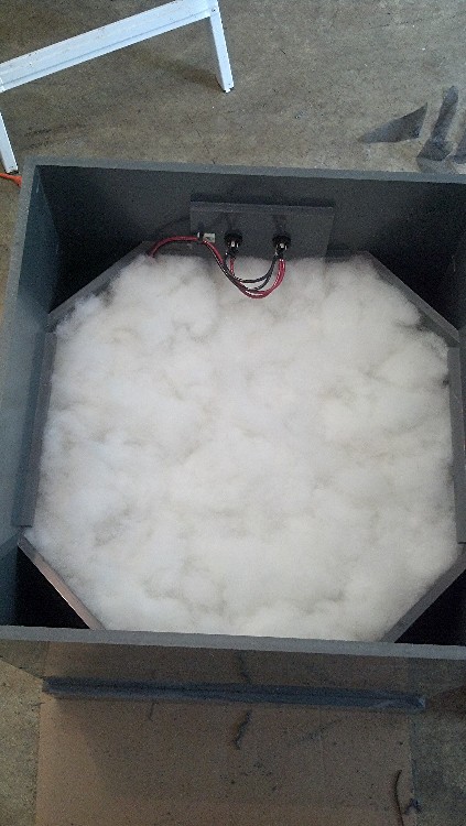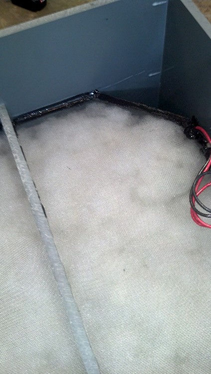 The front most layer of fiberglass screen roughed in with black silicone. This will hold the poly stuffing in place directly behind the driver. This is one aspect of the build that was very tedious compared to just popping a few staples into some burlap in a normal build. :(