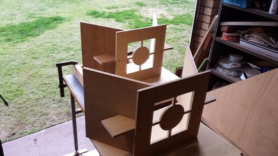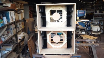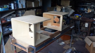 So upon finishing our T30 project, we started the first of probably 2 pairs of Otop 12's. These will be 3012HO loaded, and the first pair will have the melded piezo array. Wood and top hats purchased, we got the bottom and top panels cut and marked up, as well as the baffles and horn panel braces. We got them assembled and that's as far as we got. Drivers should be ordered in the next couple of weeks so until they arrive, we wont be going much past horn panels and throat reflectors. I plan on going with Leland's pre assembled tweeter arrays which should save some time.