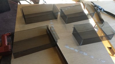 Did some work on the side panels today. Cut the tuning ports and rounded 'em over, installed half round moulding, and spent a little while on an idea I had to prevent unwanted visitors from making the inside of the OT12 their home, via the open ports. This mod also doubles to reduce visibility into the cabs insides from the outside. I got some light metal flyscreen from the local bunnings, and then measured and cut a template out of cardboard. I then cut the flyscreen into the desired shape, and folded it with a metal ruler. I used hot melt glue to seal the joints in the mesh to complete the "handle port mesh lining". I then tacked them into place on the side panels, and bogged up the contacting tabs with hot melt glue to seal/strengthen/prevent possible vibration. The result was pretty good.