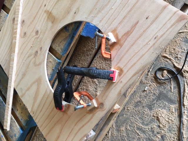 sets jigs and installed second panel, cut panel 3 and poked a hole for the drivers to breath through, made a router jig to poke the right size hole!!!!