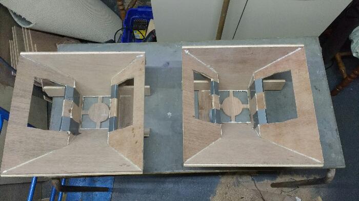 Got the horns assembled this evening. The first one was a little out of square. I realised that guide marks are required to set the height position up the baffle of the first two horn side pieces fixed - if they are not exactly the right height it throws out the bottom horn mouth piece, when it is abutted into place. I measured down from the baffle upper most outside edge for the second horn, put some marks at both ends of each piece, and that horn is bang on square. These height-wise positioning marks are actually essential if using a square block to help set the pieces, as per the plans.