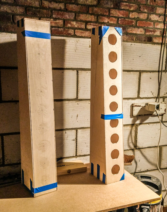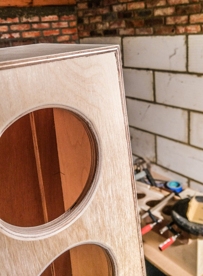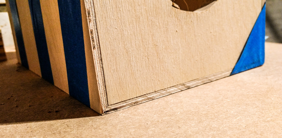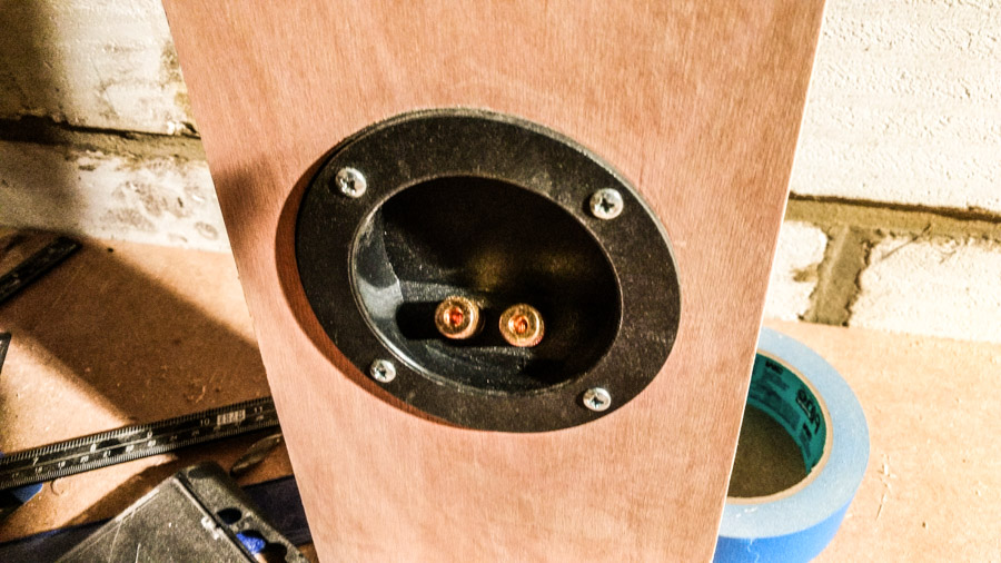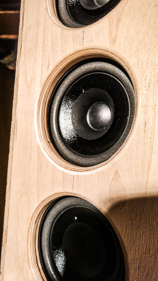 The corners of the cabinet are all cut at 45°, this way the layers of the multiplex will make nice corner. The frontpanel is recessed into the side panels. I test fitted the drivers. No glue yet, only hold by the blue tape