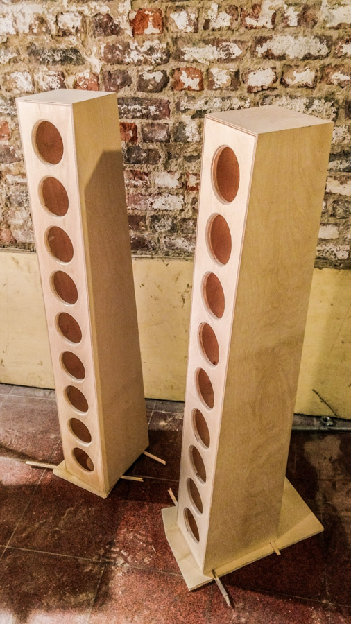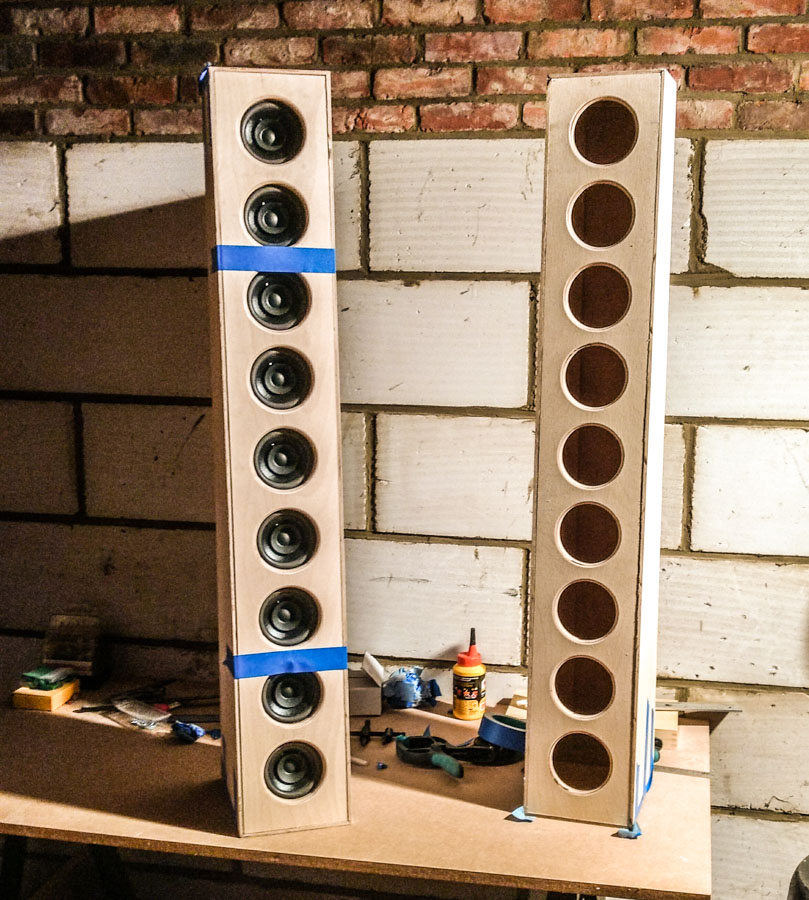 After reading through the plans and some questions asked on the forum I decided to make two cabinets with each 9 full-range 4"inch drivers from McGee