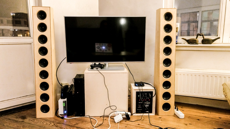 Since I'm more into listening music then having a full blast of sound kicking me out of my couch while watching a movie, I went for a stereo setup of the SLA.