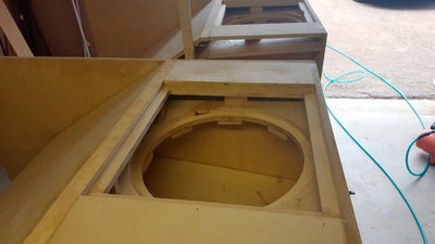 I'm not 100% done - still need to paint and install drivers but they were fully assembled in those nine days. Day one effort - woohooo panel 1 installed! No braces are shown since I took the pic after PL was cured. All panels were screwed in place using panel screws from Leland. They seem to work quite a bit better than drywall screws. Day 2 - Panel 2 (the baffle) takes a lot of time between cutting driver hole, driver anchor, and those little driver anchor blocks. Day 3 was getting panel 2 and driver reducers installed. Also spent some time on the OTop12s.