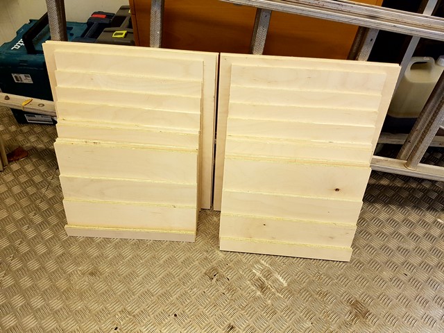 But here goes! First little time lapse is splitting the sheets into smaller strips which makes it easier to handle. I used the circular saw, as the table saw in the shop couldn't take the width of the entire sheets. Having converted the measurements in inches to millimeters, I used an online service to make the cut skeet. I will do all the individual panels with 90 degree cuts, on the maximum dimension, and thereafter do the angles on each panel.