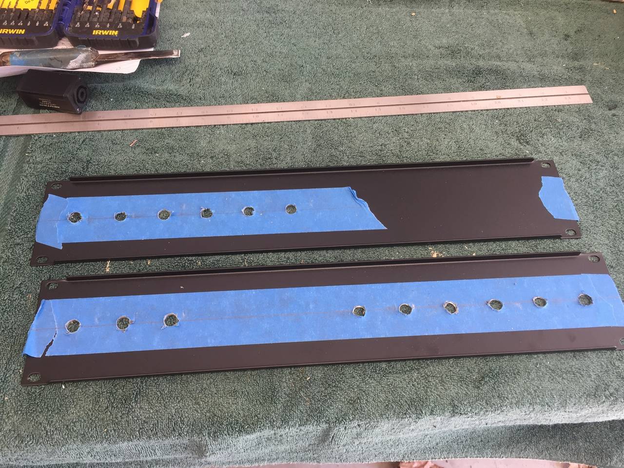 Then I used a straight edge to line 'em up and keep 'em square. With that clamped in place, I drilled all the holes for the 4-40 machine screws (available at Lowes and HD).