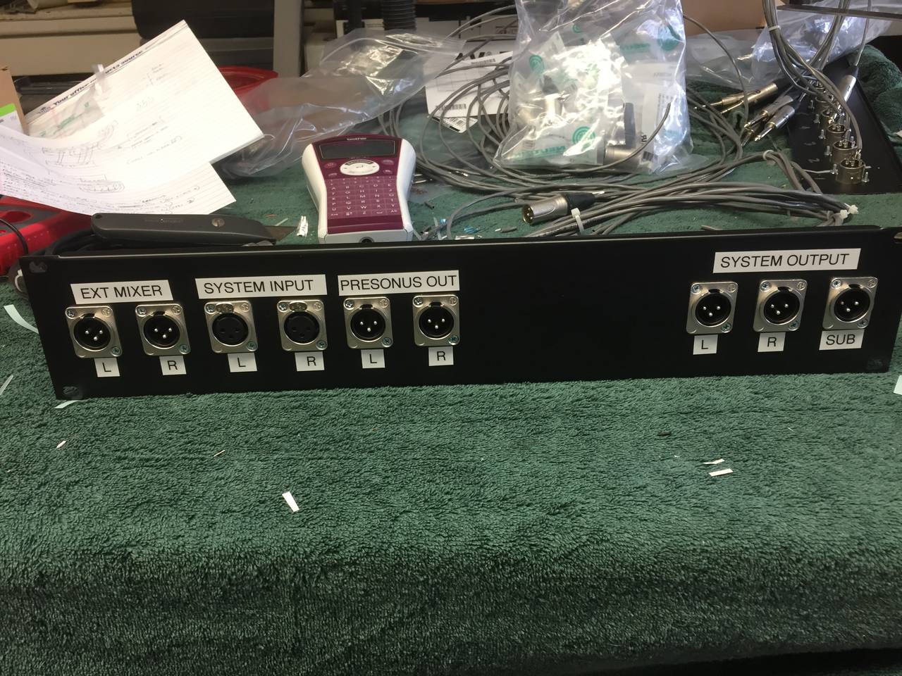 Anyway, telling you all of this so you know what I'm working with. So, I decided to build a Panel for the back of the rack that would allow not only for the Presonus mixer to be used, but also the Yamaha or any external mixer that a band might bring. Both options had to be able to access the driverack, so a jumper design was used. There were also the L,R,Sub outs to go to the input on the wall (that we just wired up yesterday).