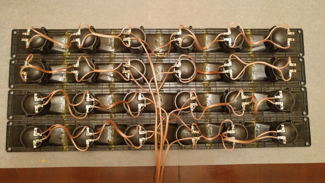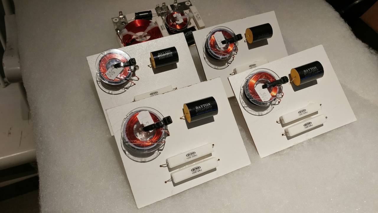 I also mounted all the crossover components to some 1/4" melamine board I found. Still haven't decided on how I'm going to terminate the inputs/outputs, so suggestions are welcome on that one. The crossover you see in the background is for the Wedgehorn 6 I will eventually be building. It's a pre-built model from Leland that I decided to go with because it has both the mid and high crossovers on one board. I think I still have enough material left over from the two 5x5 sheets of BB to build the Wedgehorn. Maybe that's a little optimistic, but the WH6 is so tiny that I think it's doable. I'm actually impressed that you can squeeze 4 SLA Pros with leftover material out of 2 sheets.