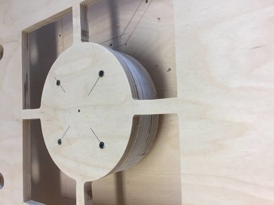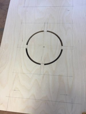 Next, I drew the baffle layout. This time I decided to use the router and a circle guide to cut the round portions. Just eyeballed it to the spoke line. Going a little deeper on each pass....