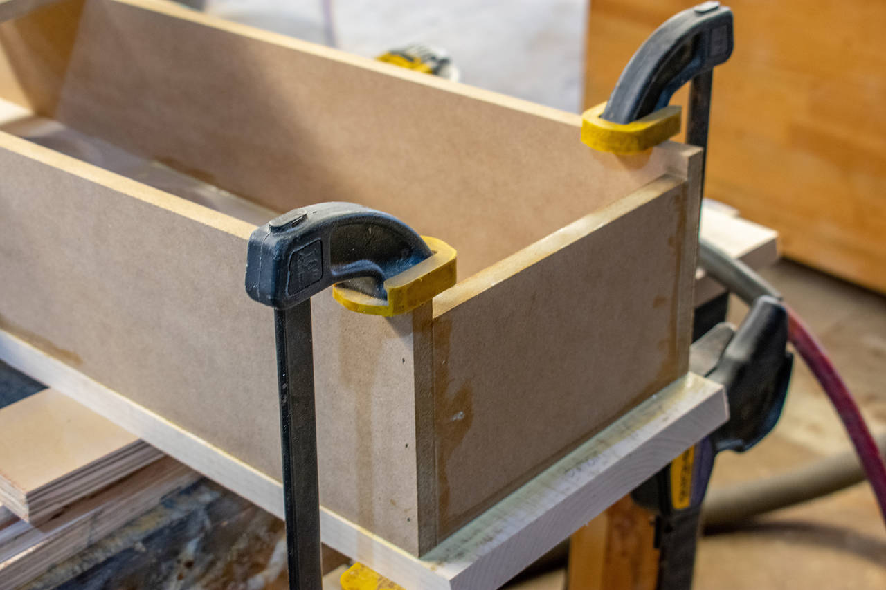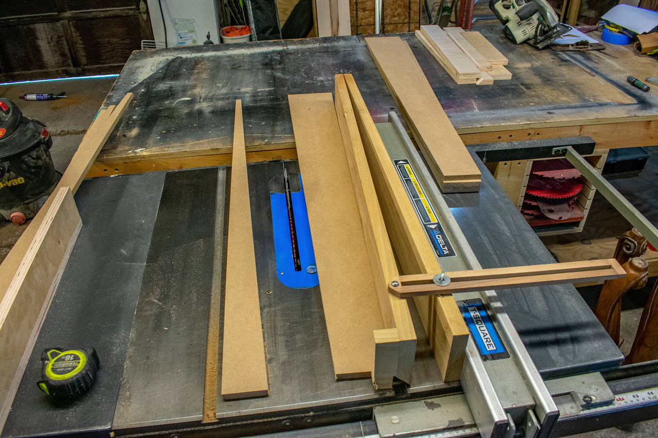 Boxes were 1/2" MDF(only because I was going to try my hand at veneering for the first time! I also got to use my homemade "taper jig". I found the plans for it somewhere on the internet, and for the 20 minutes it took to make, it has been exceedingly useful to me for repeating(safely) the same angle cuts repeatedly.