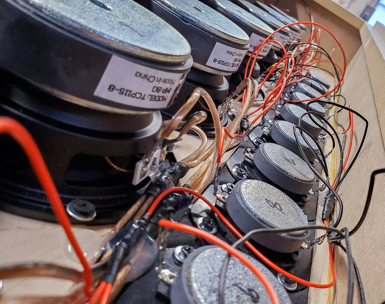 All the drivers were mounted(with speaker gasket tape from P.E. between the driver and the baffle) so that the miles of wiring could commence!