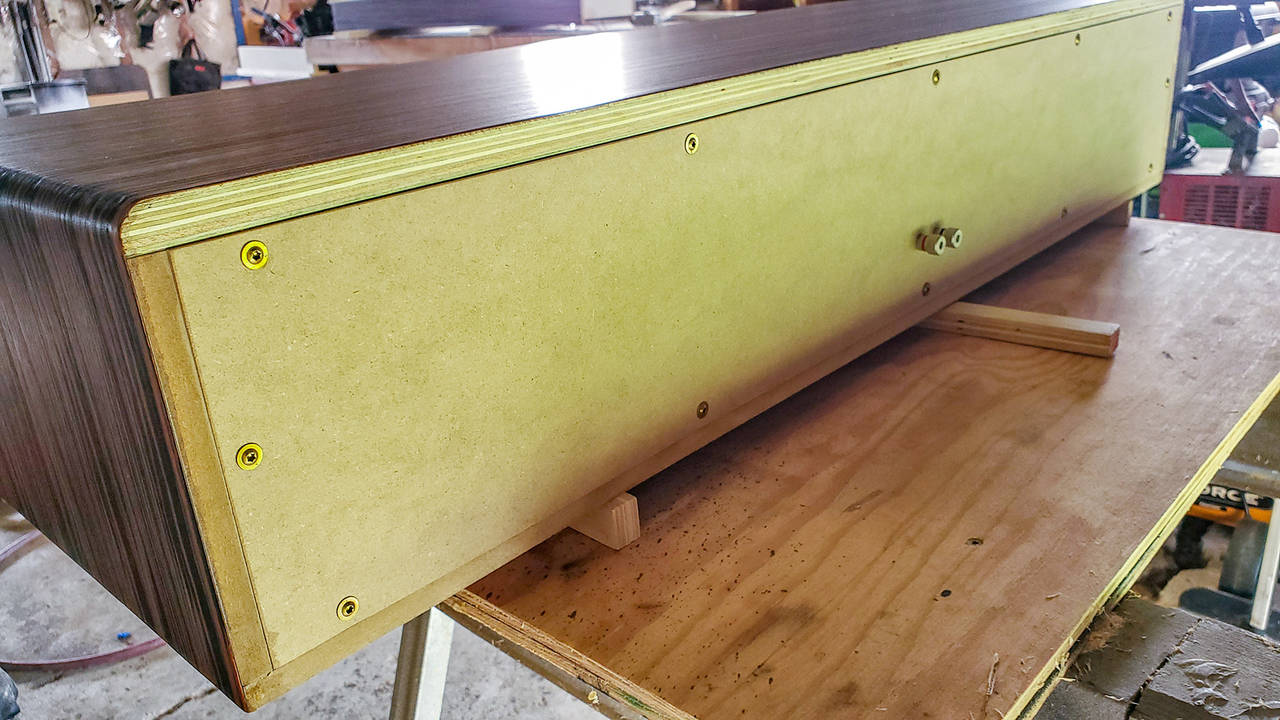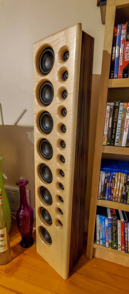 All said- the build took a little longer than I thought it would, but I was really taking my time to get everything perfect. I was going to do black duratex or something similar, and my lady-friend said that if they are gonna be seen...."Shouldn't they be beautiful?".....so she picked out Curly Maple for the baffles and some gorgeous(yet expensive!) Ebony veneer for the boxes. I think they look great!