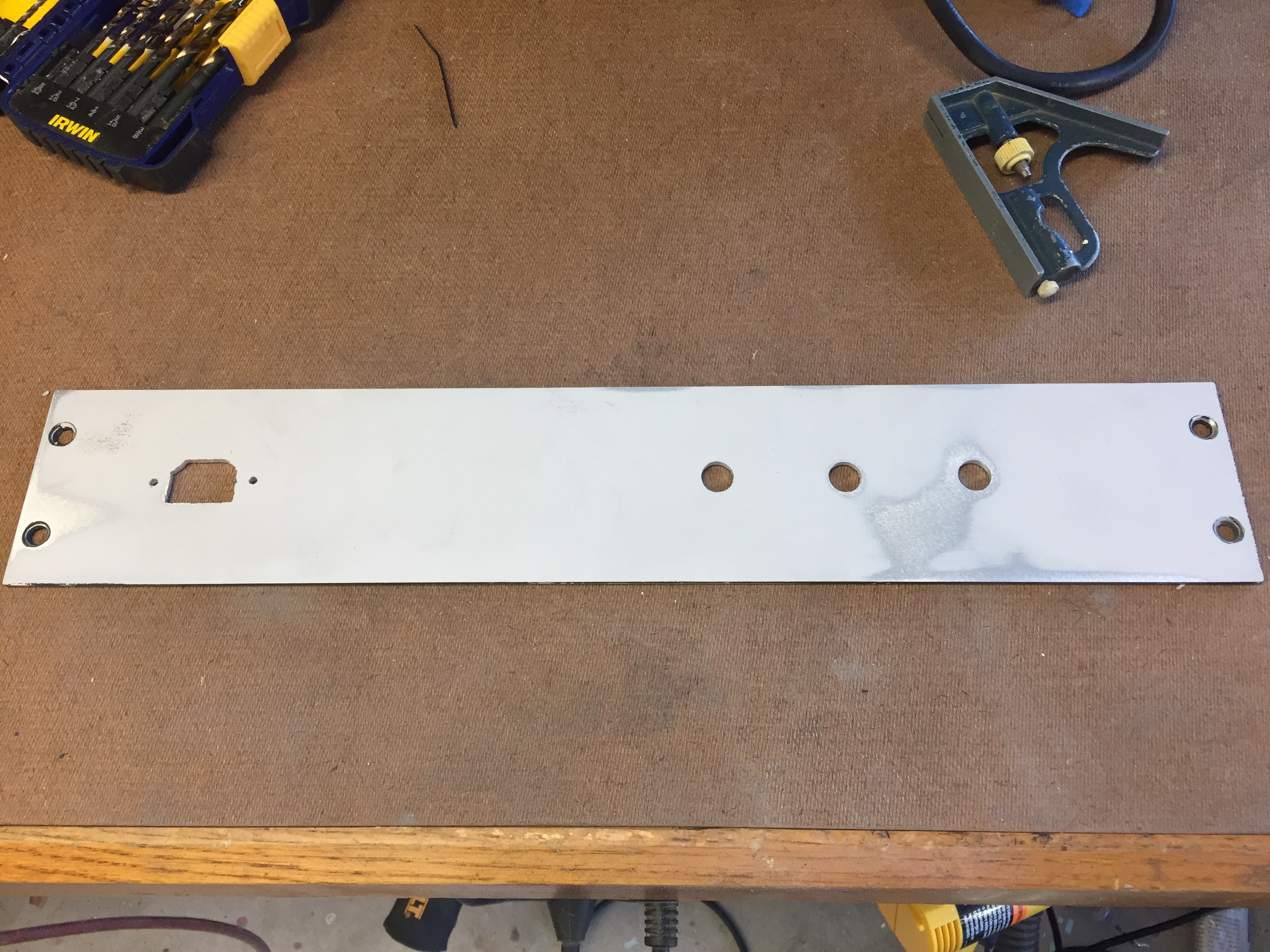 Oh, and that's a jig I built some time back for holding panels......well worth the time.. After drilling 3/8" holes, I used this amazing tool......after using a step drill for years, I finally invested in a Greenlee punch a few years ago. Makes life much easier and less messy. And after using a crescent wrench to turn the bolt to cut the holes.....I finally got smart and bought a cheap socket to use with my impact wrench....takes about two seconds...