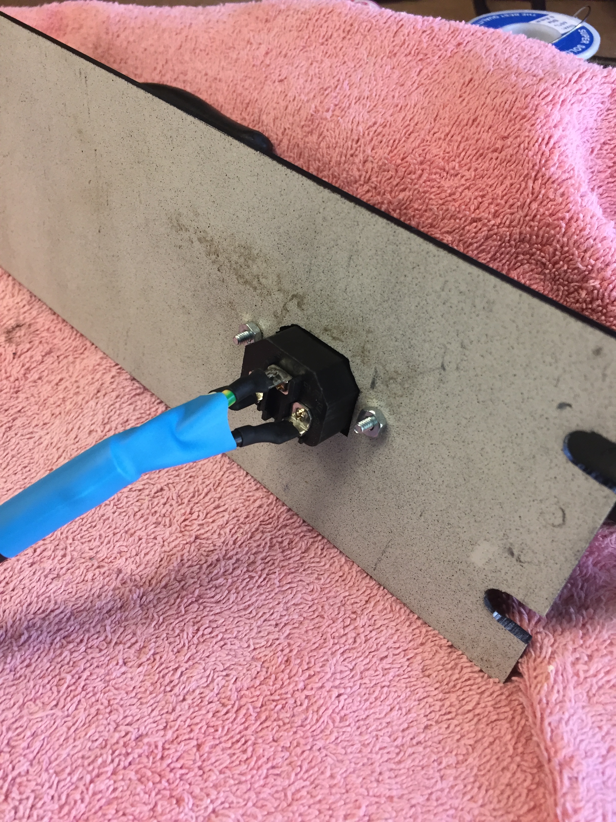 This old panel had been painted and it was looking pretty poor, so after I drilled the antenna holes, I sanded it and shot it with some fresh paint... Installed the IEC socket with some heat shrink to cover it all and then a wrap of electrical tape around the connector.