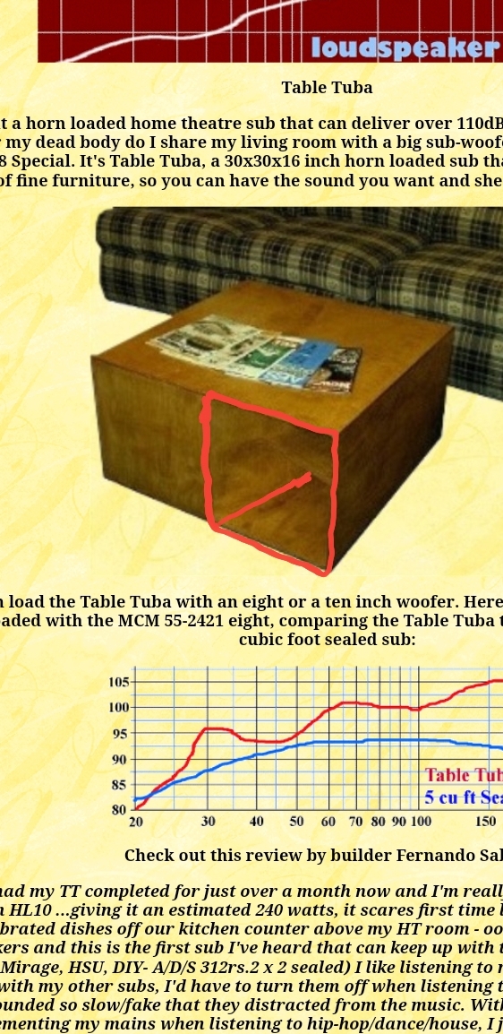 The Table Tuba is a little different from most of the other designs as it has two openings. 1 the obvious mouth of the horn and the second is the driver acess witch is usually covered up on the other plans. You can see the driver acess openings at the bottom of my long style one pictured previously. (Speaker cable coming out of the hole)