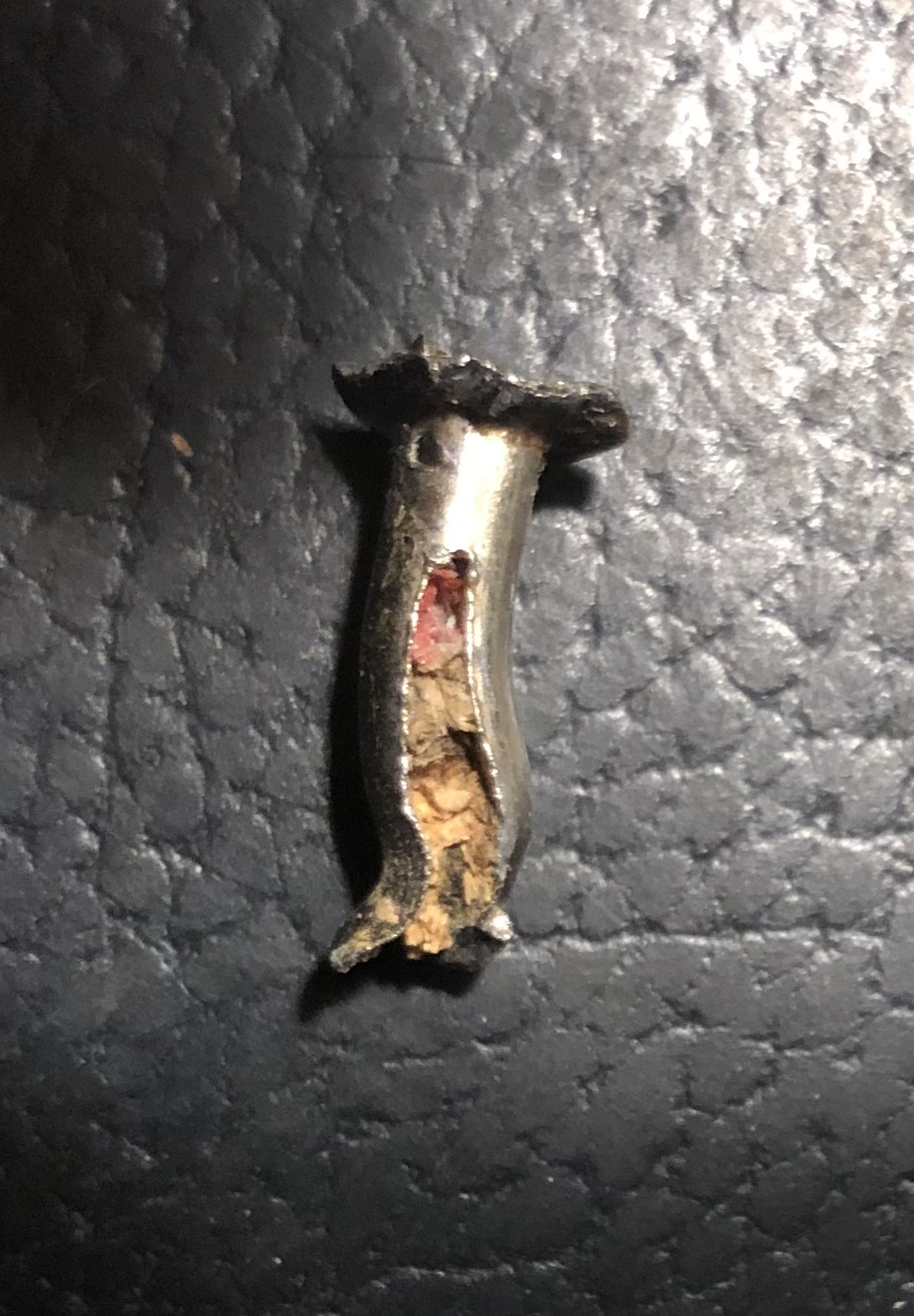 The rusty one in the second photo is a trunk nail. It doesn't go all the way through. Pull it out like a nail. They are split on the end so they will fan out and grip the wood.