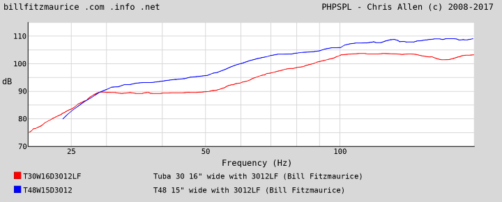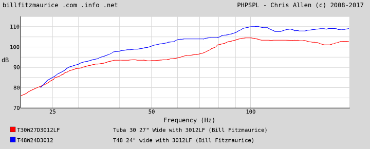 In a similar width comparison, T48 is superior, hands down. Throughout much/most of the usable frequency range the T48 would match the T30's output with ½ - ¼ or less amplifier power. Bottom chart, 60Hz... if the T30 were fed a 28volt signal (~100 watts), the T48 would match the output with only 9.15volts (~10.5Watts).