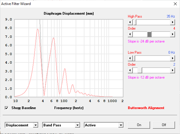 That screenshot was of the "Filter Wizzard" screen. In Hornresp, Window 1 - input parameters... the second box (Eg) is voltage. Adjust it to a voltage you suspect should do (maybe start with a voltage equivalent to RMS Power), press calculate. "Tools" dropdown, select "filter wizzard". Open the dropdown at the bottom left of the filter wizzard screen and select "Displacement". Adjust the highpass freq and slope to values mentioned in the plans. If the indicated displacement exceeds or is below the drivers Xmax, go back to the input parameters screen and adjust the voltage and do it all again until the displacement doesn't exceed the drivers Xmax. I don't know how Bill or anyone else goes about it, but that's what I've done. It's just what made sense to me. It could be completely wrong or there may be a better way to do it.