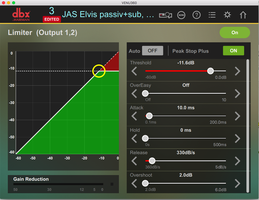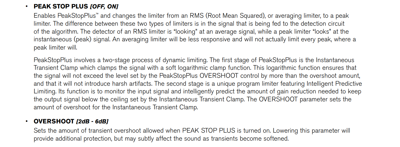 Just went and looked at the manual....more options with the 360. Turn the OverEasy and Auto OFF. Turn the Peak Stop Plus ON. Set the Overshoot as low as will go. Give that a try. That should be as tight as the unit can be on the limiter.Bruce Weldy wrote: ↑Sun May 15, 2022 9:04 am First.....are you sure you are in the limiter section and not the compressor section? I haven't used the 360, but on the other driveracks, you have to page past the compressor to get to the limiter.